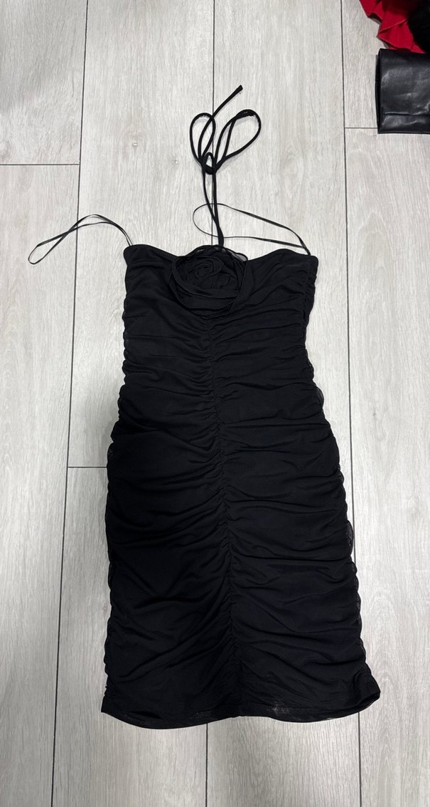 Siyah, vücuda oturan bu abiye elbise, straplez yaka ve ince askılar ile drapeli detaylara sahiptir, gotik parti tarzı için uygundur.