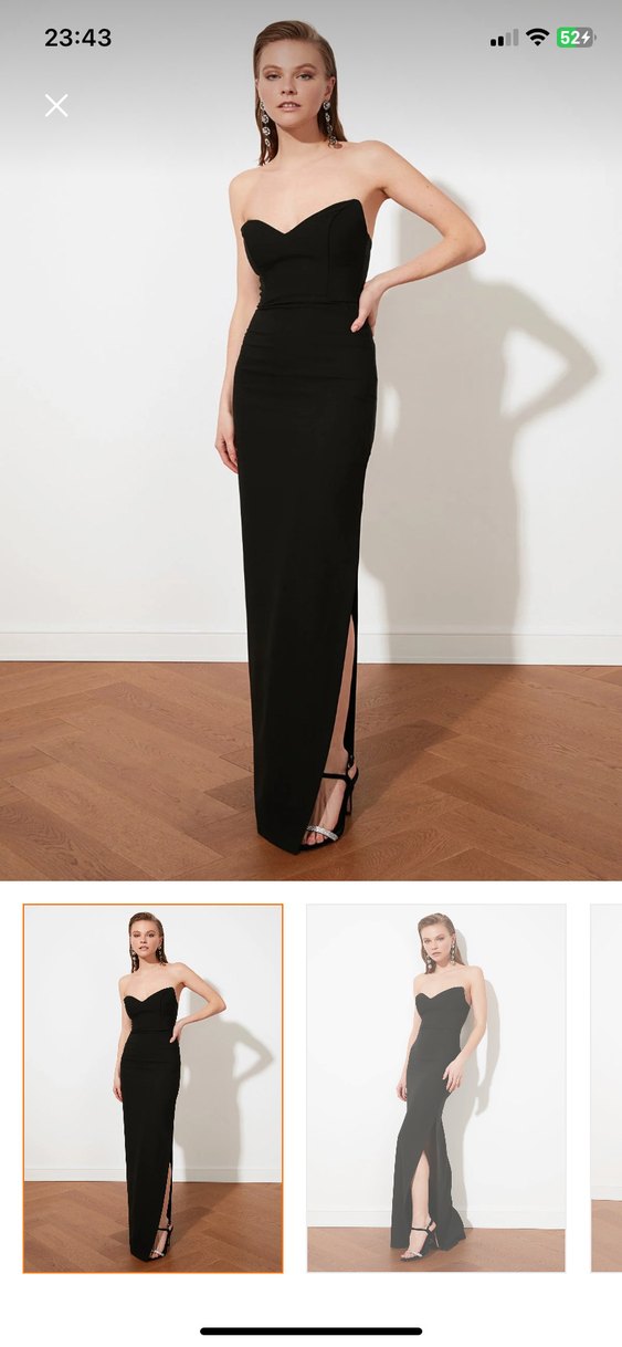 Siyah, straplez uzun elbise, ipeksi kumaş, drapeli tasarım ve ince askılarla tamamlanmıştır. Minimalist, çağdaş tarzda, klasik ve şık bir görünüme sahiptir. ✨ bir kere mezunıyette giydim sadece