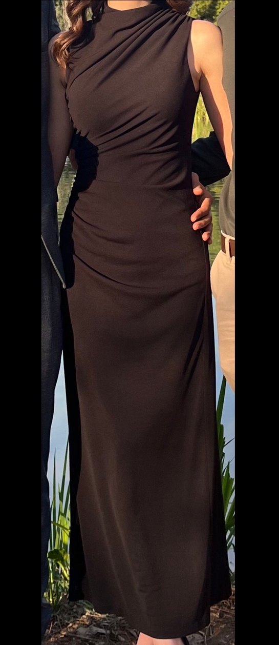 Bu siyah uzun elbise, straplez yaka ve ince askılıdır. Drapeli ve vücuda oturan kesimiyle klasik gotik tarzı yansıtır. Düğün için uygundur..