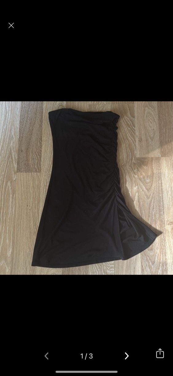 Siyah renkte, straplez ve drapeli uzun elbise. Kolsuz, vücuda oturan kesimiyle minimalist gotik tarzda, romantik akşamlar için uygun. Desensiz ve şık.