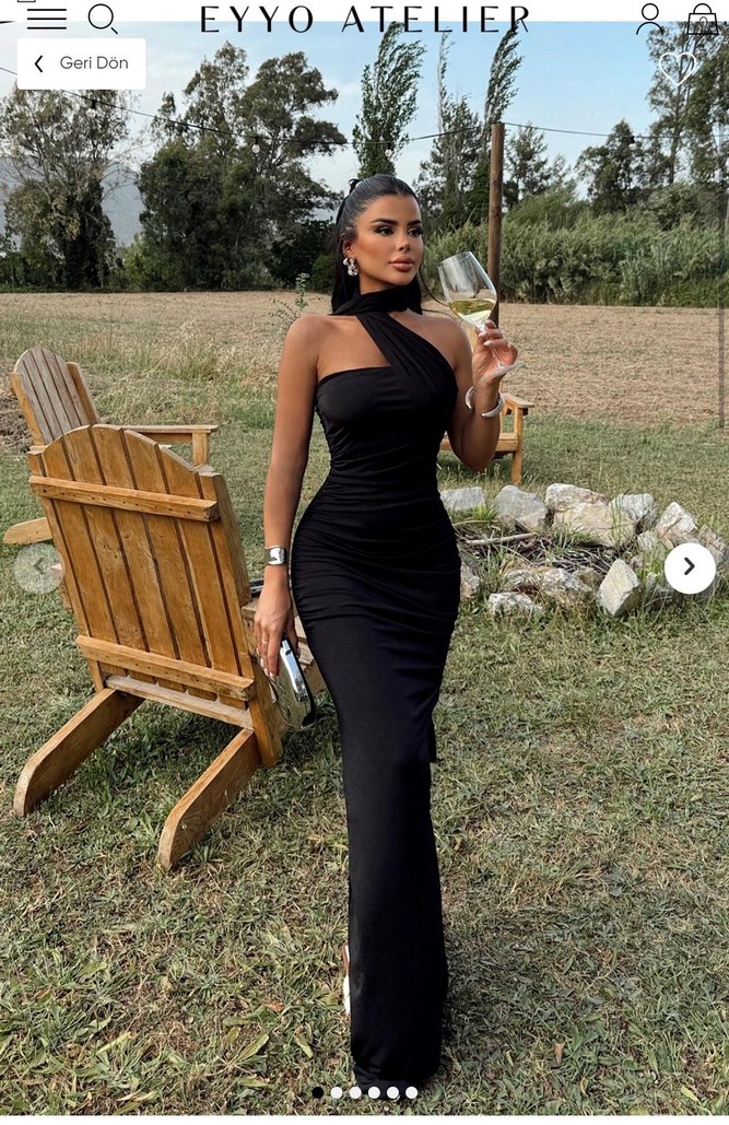 Siyah, drapeli detaylı, uzun ve straplez kesim elbise, ince askılı ve ipeksi kumaştan, cesur sokak stili için uygundur. Açık hava etkinliklerine ideal.