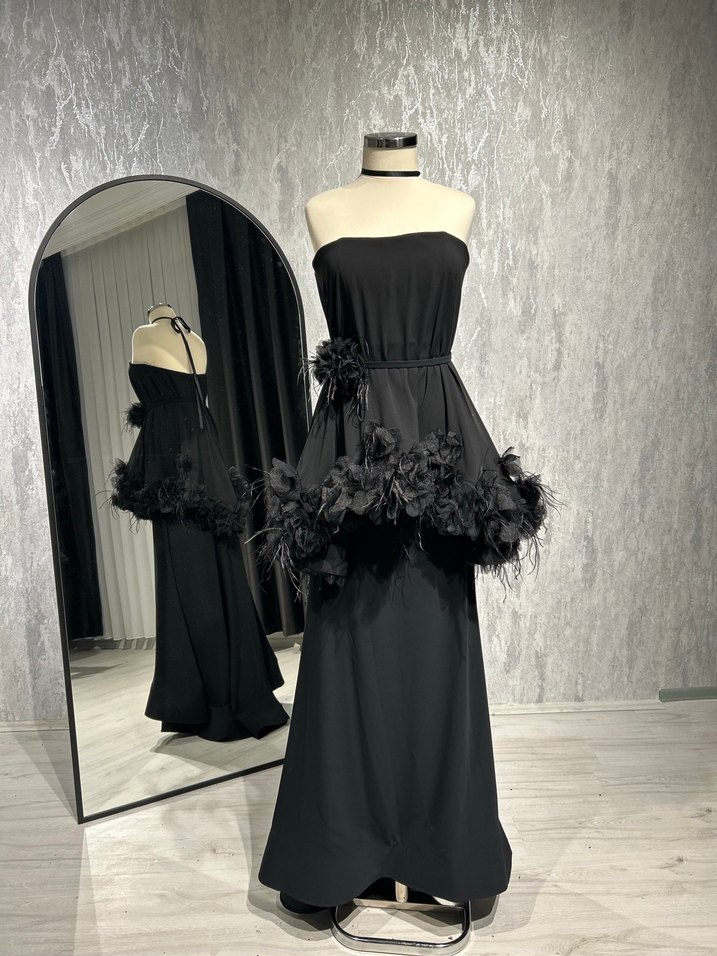 Siyah, straplez yakalı, drapeli ve ince askılı, uzun ve vücuda oturan ipeksi kumaştan kadın elbisesi, gotik ve avangart gül detaylı .hiç kullanılmadı 0 ürün 38 40 bedene uyar