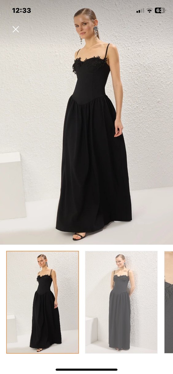 Siyah, straplez, kolsuz uzun elbise, ipeksi kumaştan, drapeli ve bol kesimdir. Modern klasik tarzda, düğün için uygundur BİR KEZ DÜĞÜNDE GİYDİM 36 BEDENİ STOKLARDA BULUNMUYOR YENİDİR
