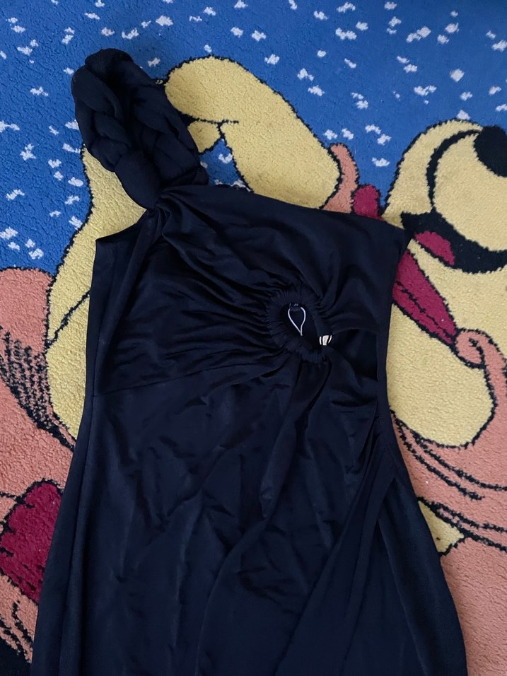 Drapeli ve straplez tasarıma sahip, uzun ve kolsuz, fit kesim gece elbisesi. Koyu mavi ve desensiz kumaftan üretilmiştir. yırtmaçlı tek kol büzgülü şık elbise