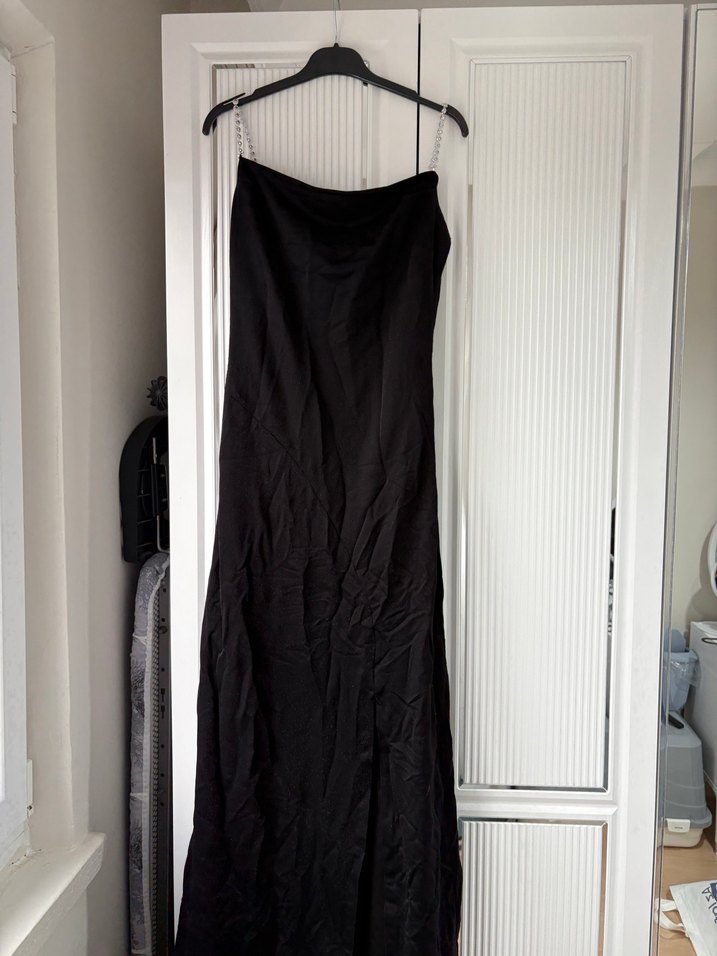 Siyah, straplez uzun elbise, ince oturan kesim ve ipeksi dokusuyla drapeli tasarıma sahiptir, romantik akşamlar için uygundur. Yırtmacını 1 dikiş ile daraltmıştım ip kesildiği anda açılır sıkıntı çıkarmaz etek boyunu biraz kısaltmıştım 140 cm