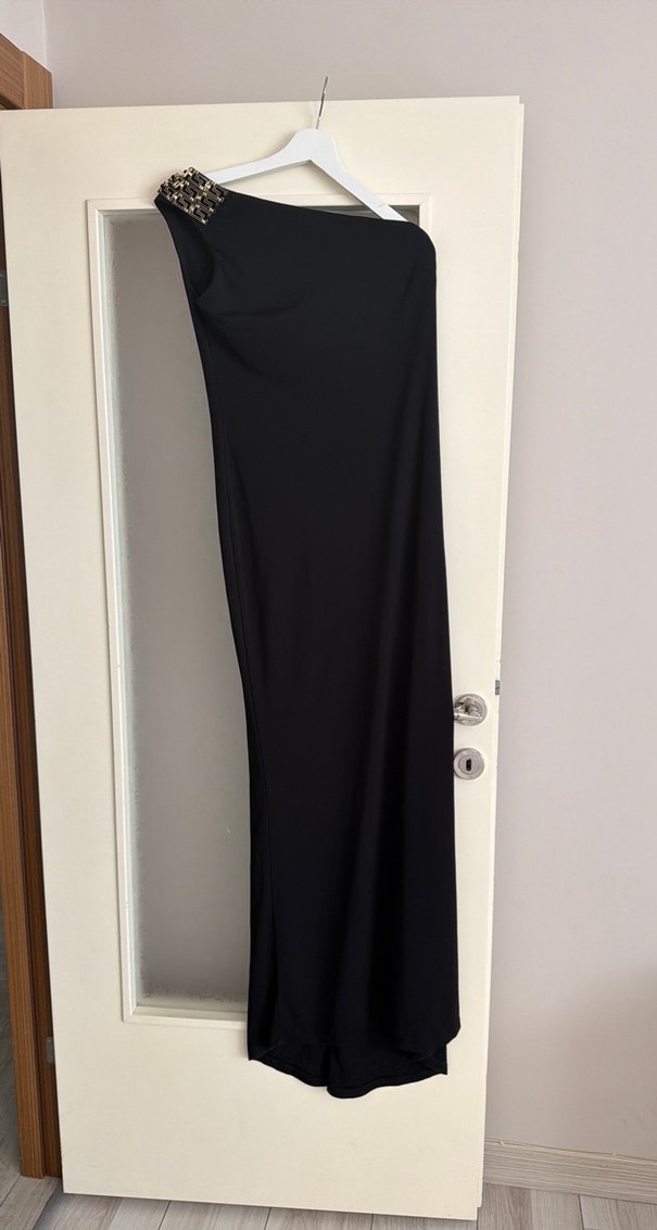 Siyah, tek omuz drapeli, kolsuz, uzun ve vücuda oturan abiye elbise, minimalist ve avangart tarz için uygun.