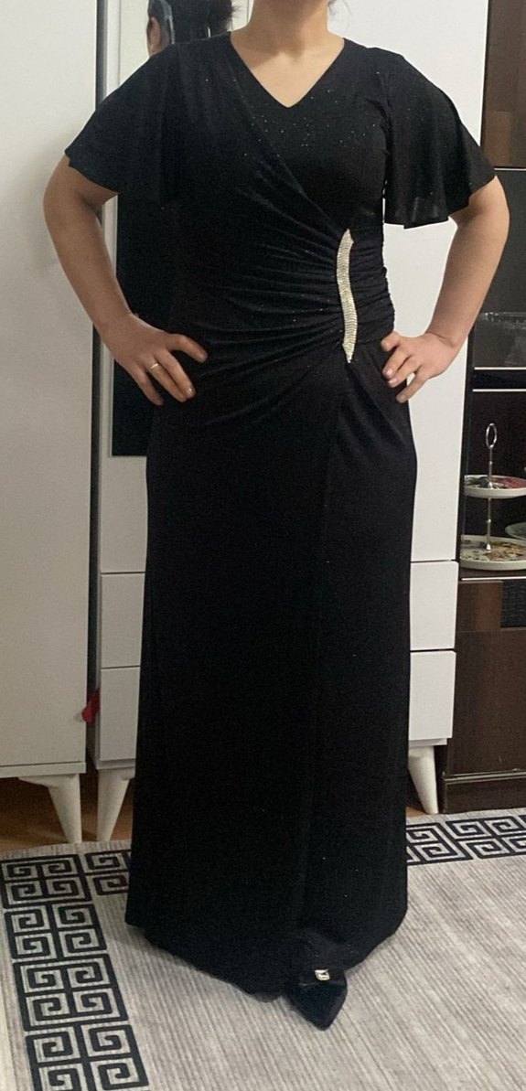 Siyah Drapeli Uzun V Yaka Abiye Elbise