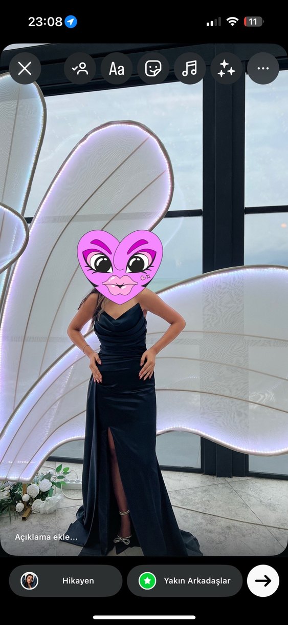 Bu siyah, drapeli ve V yakalı uzun abiye elbise, dar kesim ve askılı kollara sahip. Avant-garde gotik tarzıyla dikkat çeker, baskılı deseni bulunur.