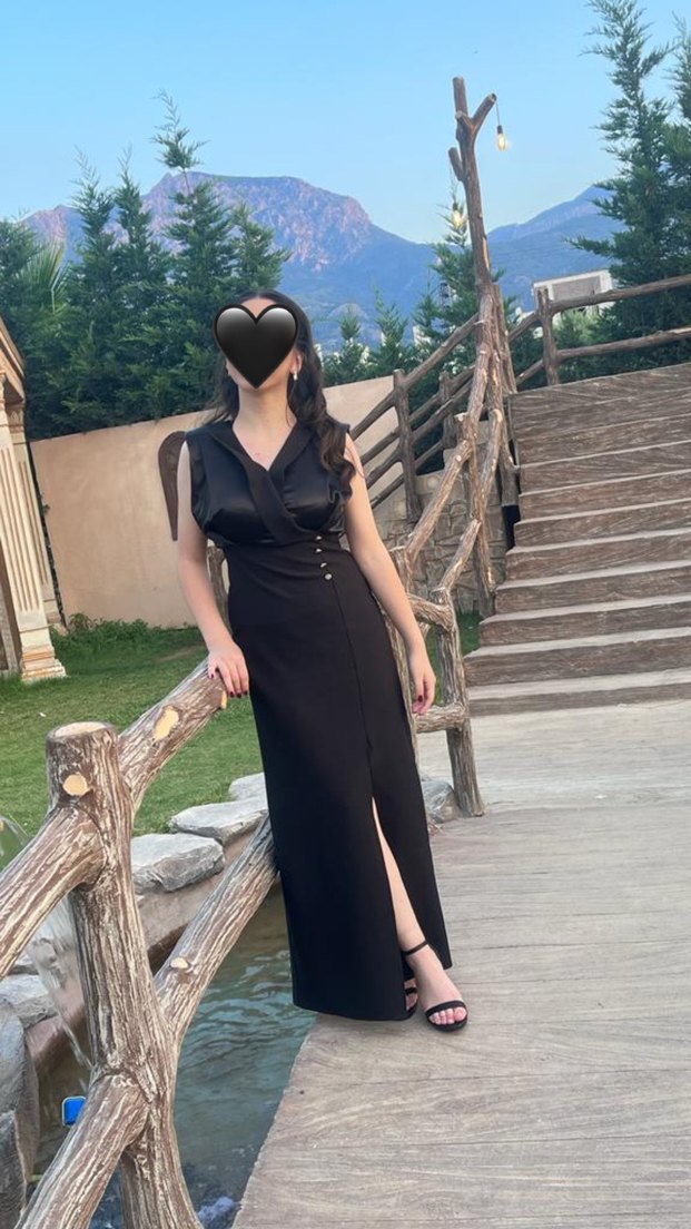 Siyah, uzun boy gotik elbise, V yakalı ve askılı kollu, drapeli tasarıma sahiptir. Sırt dekoltesi yoktur.İpeksi kumaştan üretilmiş, cesur ve rahat kesimlidir, güzel akşamlar için uygundur.