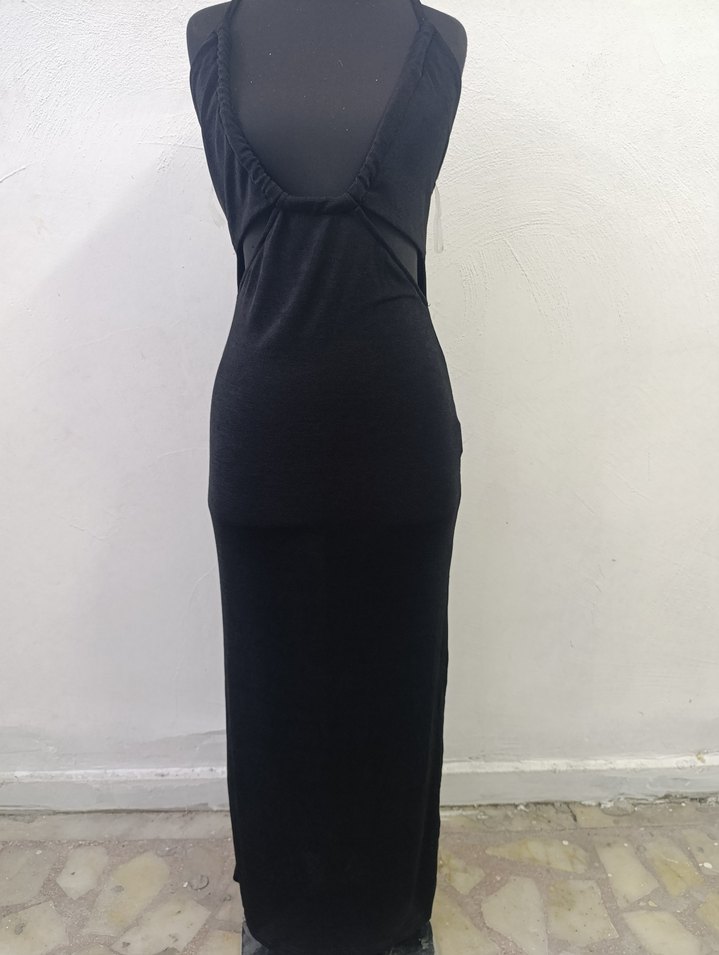 Siyah, drapeli ve derin V yakalı, kolsuz uzun elbise. Sentetik kumaştan, dar kesim ve romantik akşamlar için uygun. ( fotoğraf kalitesi için özür diliyorum elimden gelenin en iyisiydi )