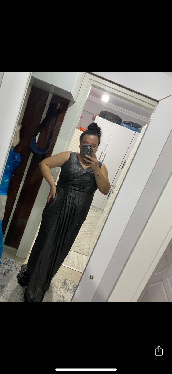 Drapeli tasarıma sahip, V yakalı ve askılı kol detaylı, siyah uzun ve vücuda oturan kadın elbisesi. Sentetik kumaştan üretilmiştir.