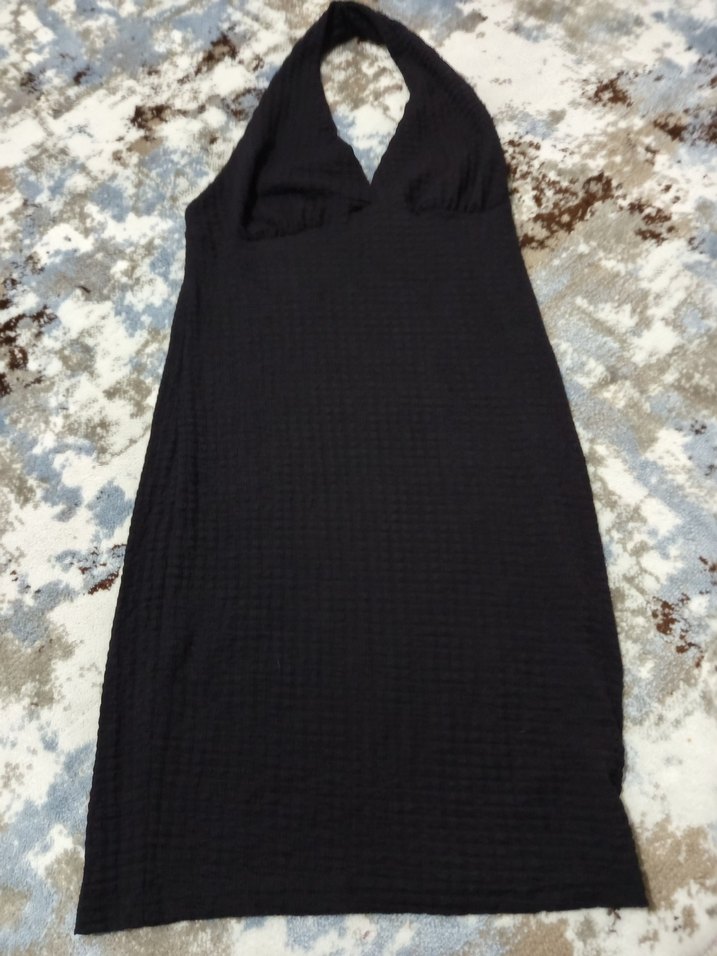 Siyah, drapeli V yaka, kolsuz ve uzun boylu bu kadın elbisesi, gotik tarzda şık bir görünüm sunar.