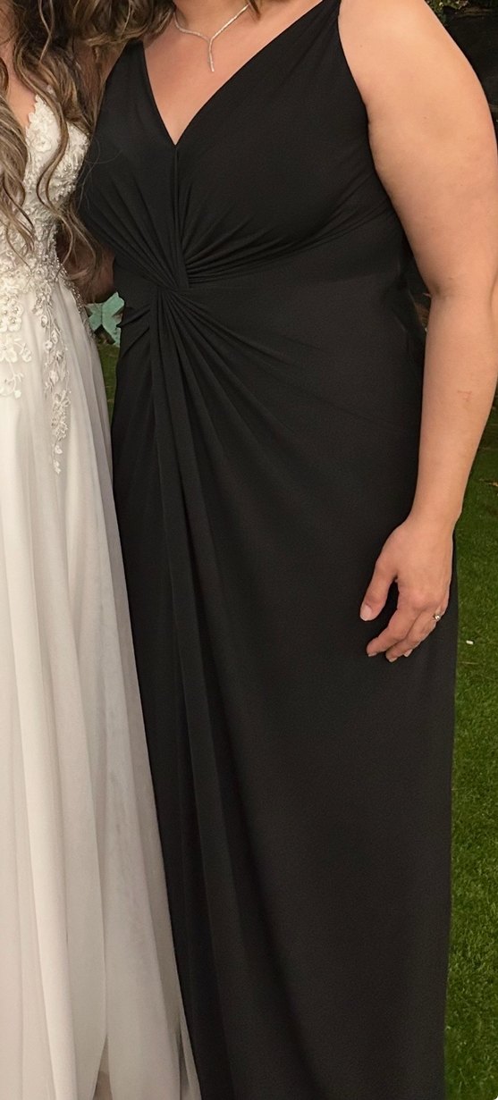 44-46 beden. Karnı saklıyor, drapeli tasarımı, V yakası ve ince askılarıyla klasik siyah abiye elbise, düğün ve özel günler için uygun.