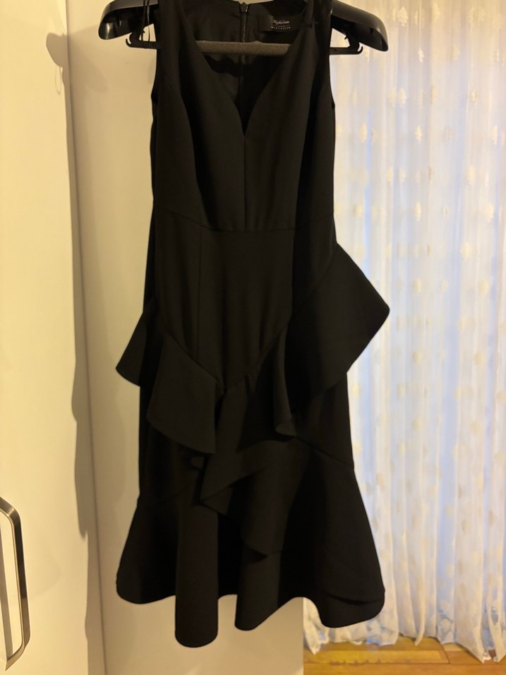 Siyah, v yakalı, kolsuz ve drapeli detaylara sahip, uzun ve dar kesim gotik abiye elbise. Ofis için uygun şık bir model.