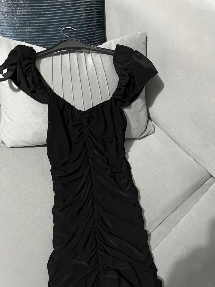 Siyah, drapeli ve V yakalı bu dar kesim abiye elbise, gotik ve avangart tarzı sevenler için uygundur.