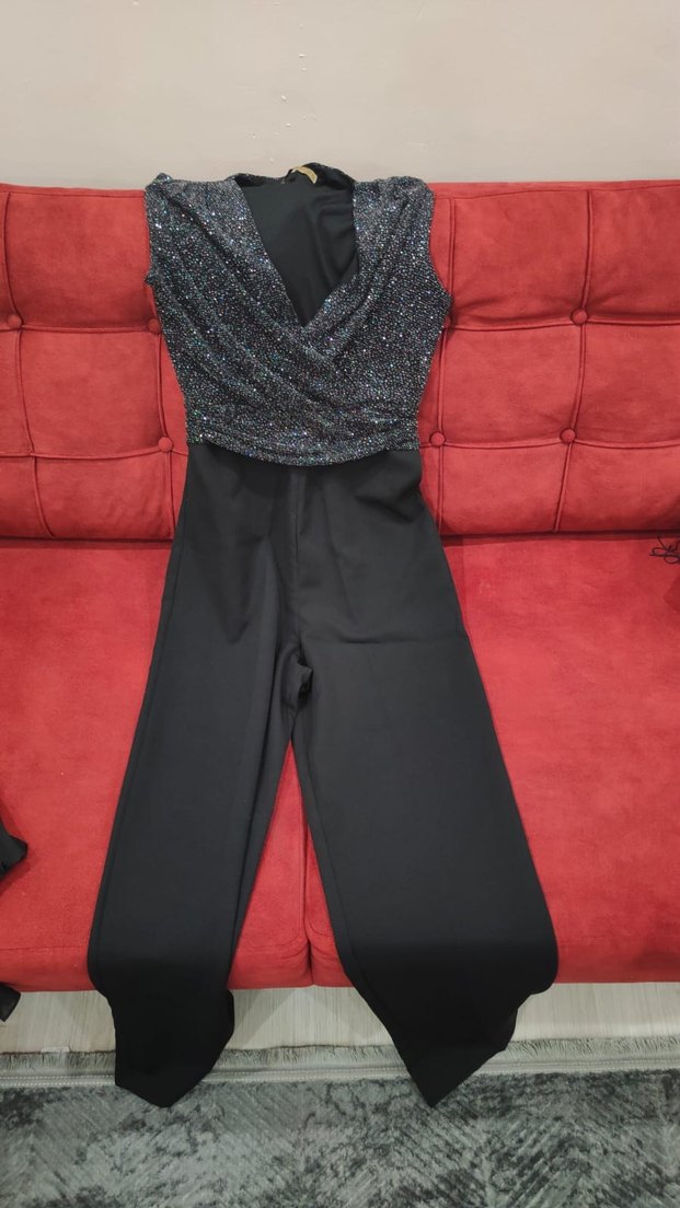 Siyah tulum, drapeli ve ışıltılı üst kısmı, kolsuz V yakası ve dar kesimiyle parti için uygundur. ✨