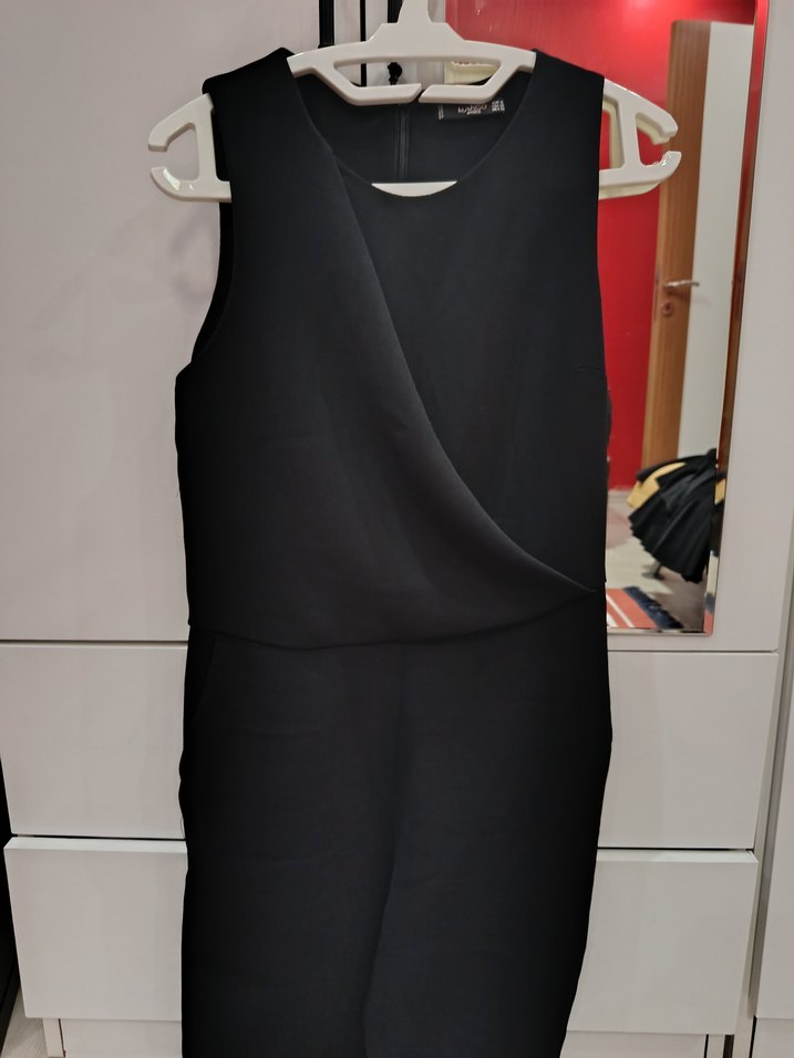 Siyah, kolsuz, v yaka ve drapeli detaylı, ince kesim tulum.
