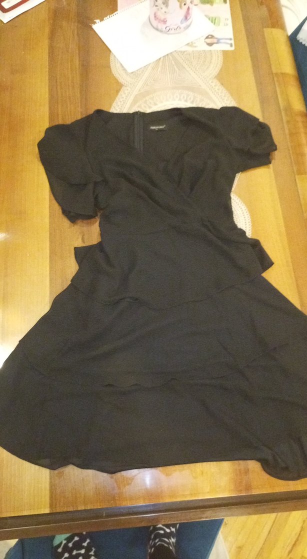 Siyah, drapeli detaylara ve kısa kollara sahip, V yakalı, goth tarzı midi elbise. Trend belirleyiciler için koyu ve avangart bir görünüm sunar.