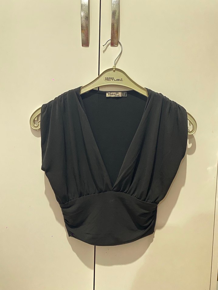 Siyah kolsuz bluz, derin V yaka ve drapeli detaylara sahiptir. Sentetik kumaştan yapılmış, kısa ve vücuda oturan kesimiyle şık ve minimal bir görünüm sunar.