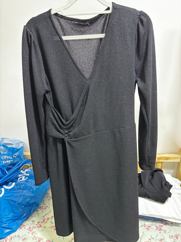 Drapeli tasarımı, uzun kollu ve V yakasıyla siyah, vücuda oturan midi elbise. Ofis veya akşam kullanımı için uygun, rahat ve deseniz kumaşla şık sokak stili sunar. ✨ BİR KERE GİYDİM