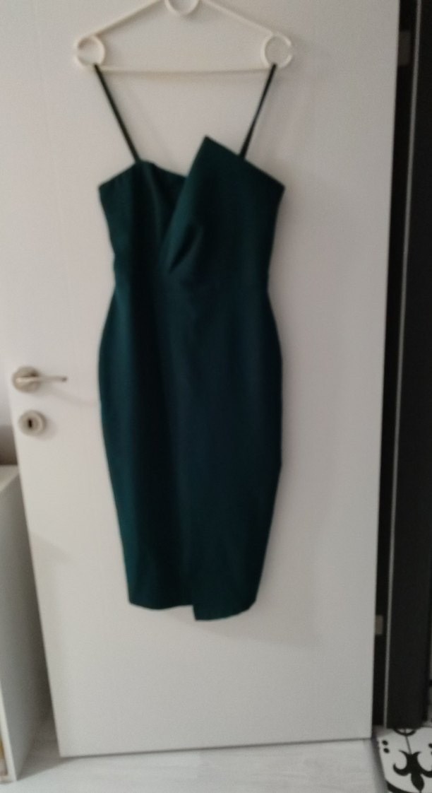 V yaka, kolsuz, drapeli detaylara sahip siyah midi boy dar kesim elbise, modern ofis stiline uygundur.