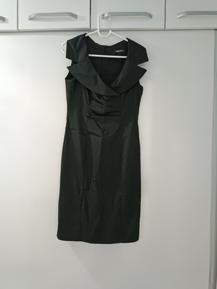 Kolsuz, v yaka ve drapeli detaylı siyah midi elbise, vücuda oturan kesimiyle ofis ve özel günler için uygun.
