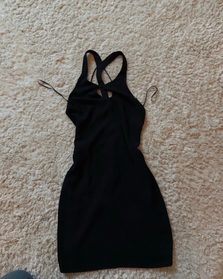 Siyah, drapeli detaylı, V yaka ve askılı, vücuda oturan midi elbise. Gotik tarzda, desen içermeyen, romantik akşamlar için uygun.