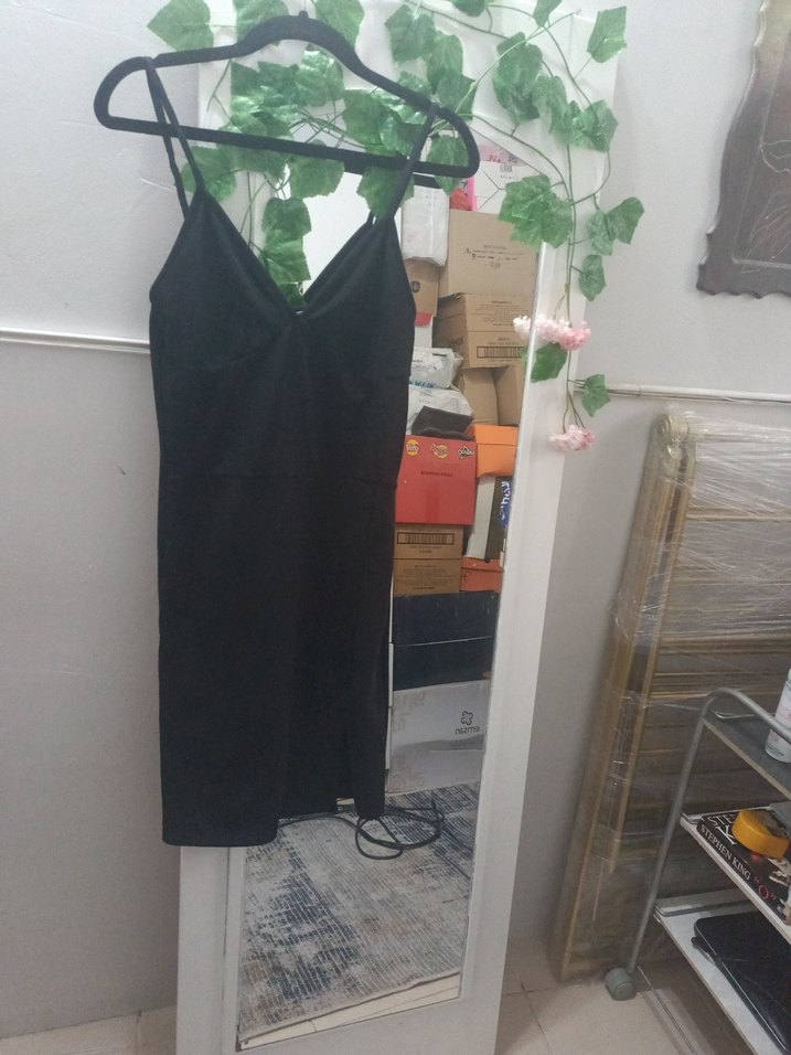 Siyah midi elbise, fitted kesim, V yaka ve ince askılı. Drapeli detaylarla minimalist gotik tarz sunar, günlük kullanıma uygun. eni 40 cm uzunluğunda 80 cm. ürünüm temizdir