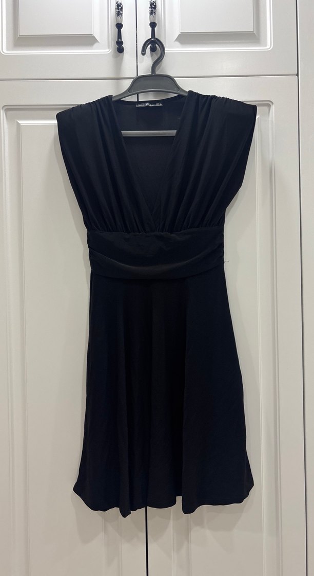 Siyah, drapeli V yakalı, kolsuz midi elbise. Minimalist gotik tarzda, klasik şıklık sunar.