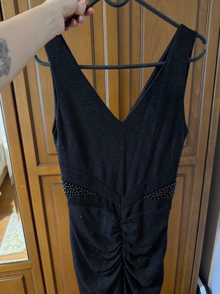 Siyah, v yaka ve kolsuz tasarıma sahip, drapeli detaylar ve boncuk süslemeleri bulunan, parti için uygun oturan midi elbise.