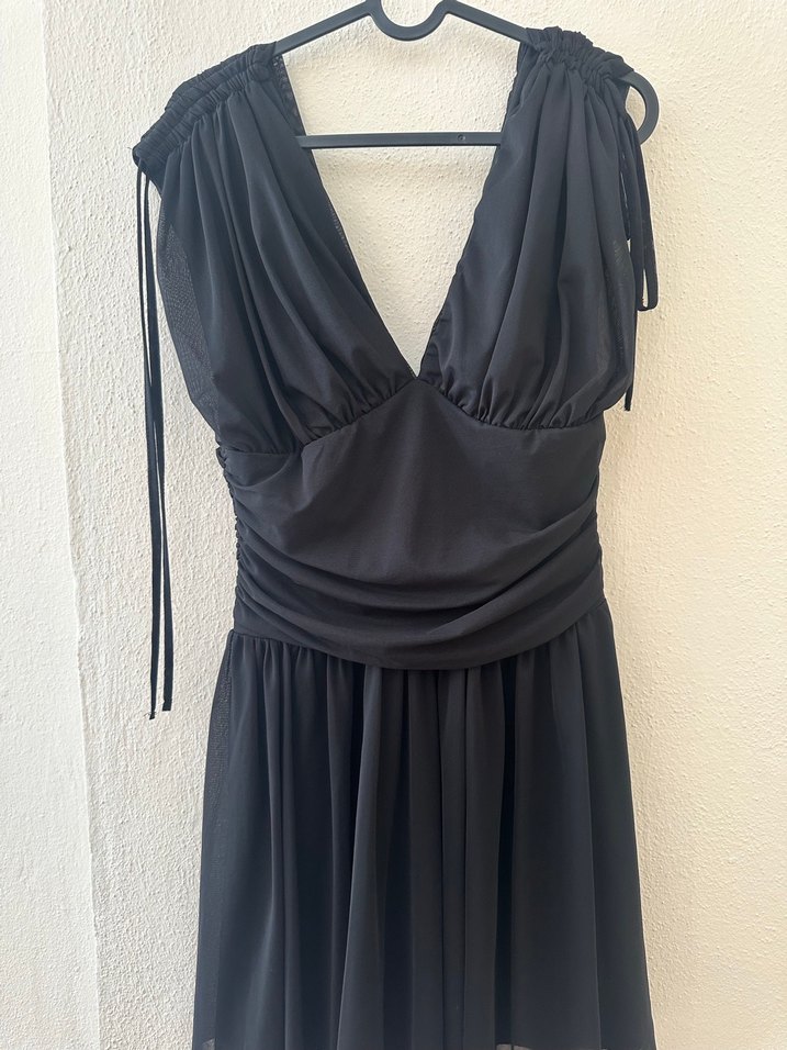 Drapeli tasarımı, derin V yaka ve ince askılarıyla siyah, vücuda oturan midi elbise, gotik tarzı yansıtarak romantik akşamlar için uygundur.