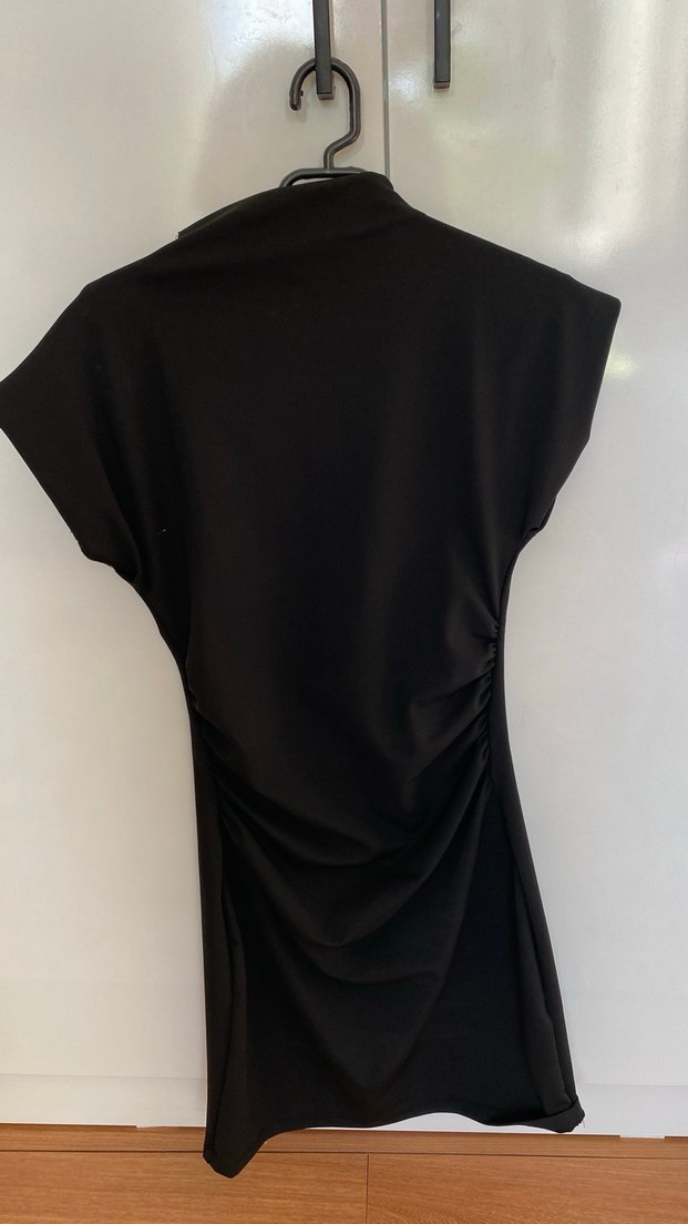 Siyah, kolsuz, v yakalı ve drapeli detaylara sahip, ofis için uygun minimalist gotik tarzda, vücuda oturan midi kadın elbisesi.