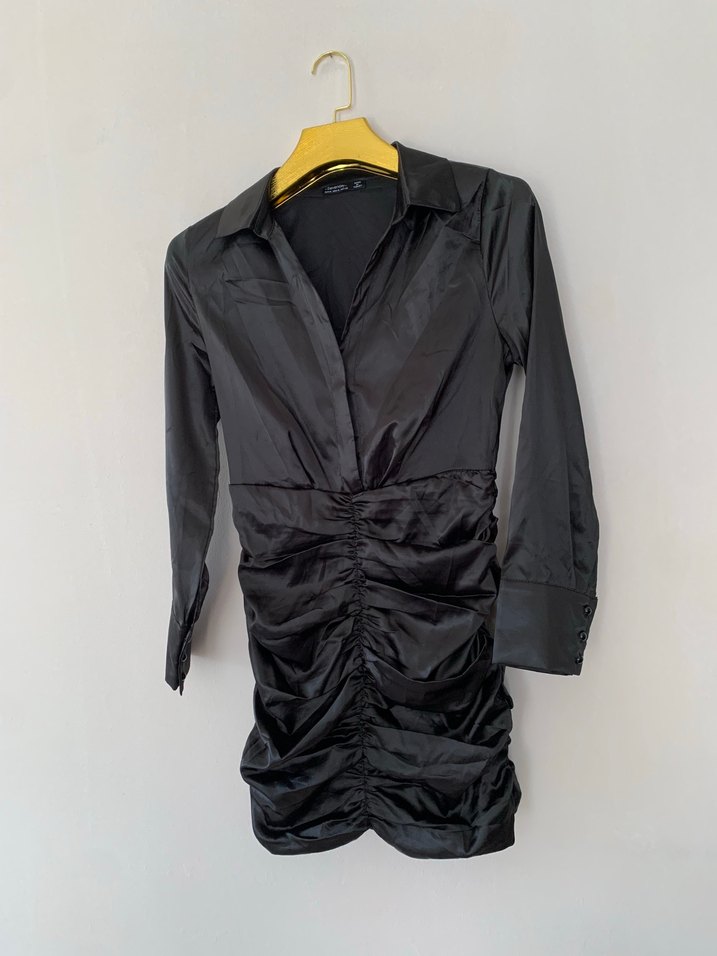 Siyah, drapeli ve midi boyda, uzun kollu, V yakalı, saten dokulu kadın elbisesi. Gotik ve Paris tarzını yansıtan cesur bir model.