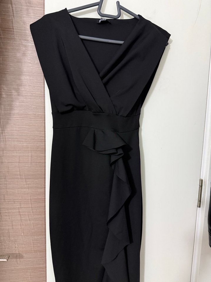 V yakalı, kolsuz ve drapeli tasarıma sahip siyah uzun abiye elbise, klasik ve şık bir iş tarzı sunar.