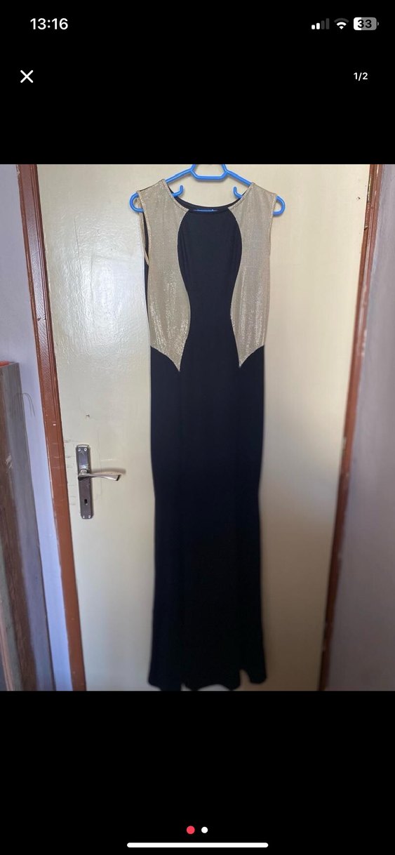 Kolsuz, fitted kesim uzun abiye elbise, drapeli detay ve V yakaya sahip. Siyah ve metalik tonlarla modern klasik tarz sunar, düğün için uygun. ✨balık model m beden
