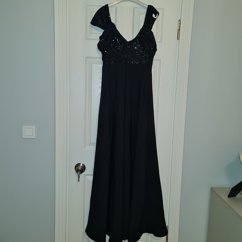 V yaka ve kolsuz kesime sahip, drapeli ve dar kesim siyah abiye elbise, klasik gotik şıklığını yansıtıyor.