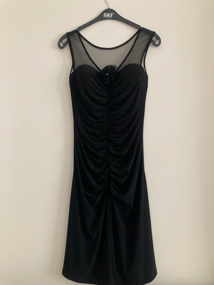 Siyah, drapeli, V yaka, kolsuz ve uzun kesime sahip klasik gotik tarzda abiye elbise.