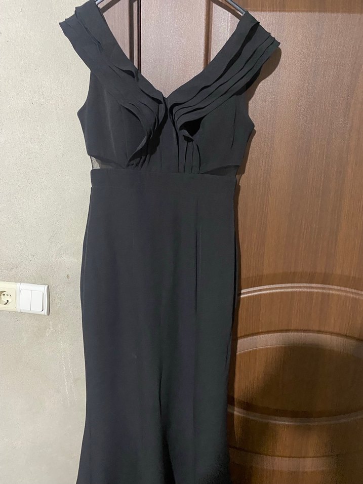 Siyah, drapeli V yaka ve kolsuz, uzun boy abiye elbise. Balık model tarlatanlı defo yok