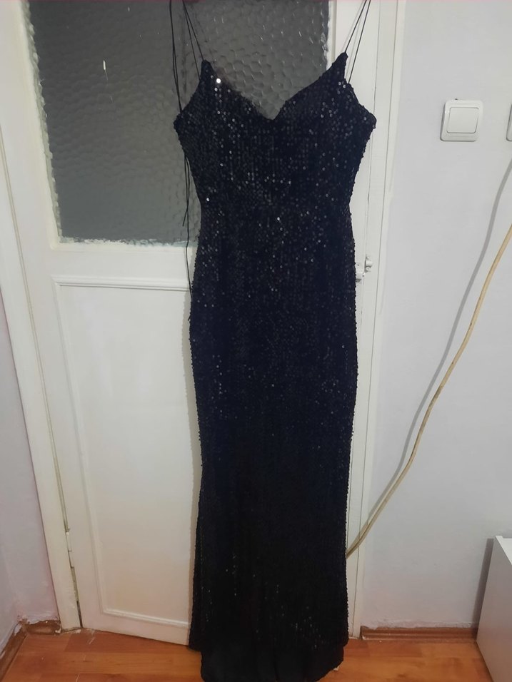 Siyah uzun abiye elbise, drapeli ve V yakalı, kolsuz, vücuda oturan kesimle romantik akşamlar için uygun, gösterişli gotik tarzda.