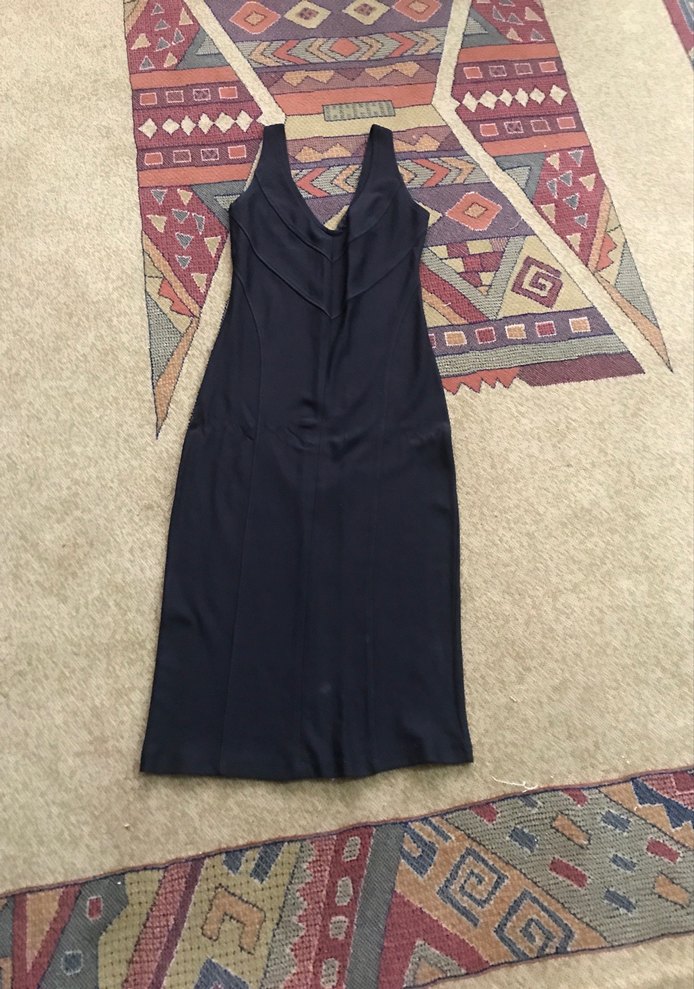 Siyah renk, drapeli V yaka, kolsuz ve vücuda oturan uzun elbise, pürüzsüz sentetik kumaştan, şık sokak ve ofis stili için uygun.