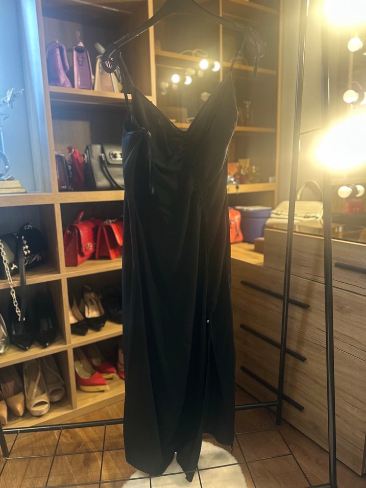 Siyah uzun elbise, drapeli ve V yaka kesimiyle, kolsuz ve vücuda oturan satenimsi kumaştan üretilmiştir. Romantik akşamlar için uygundur.