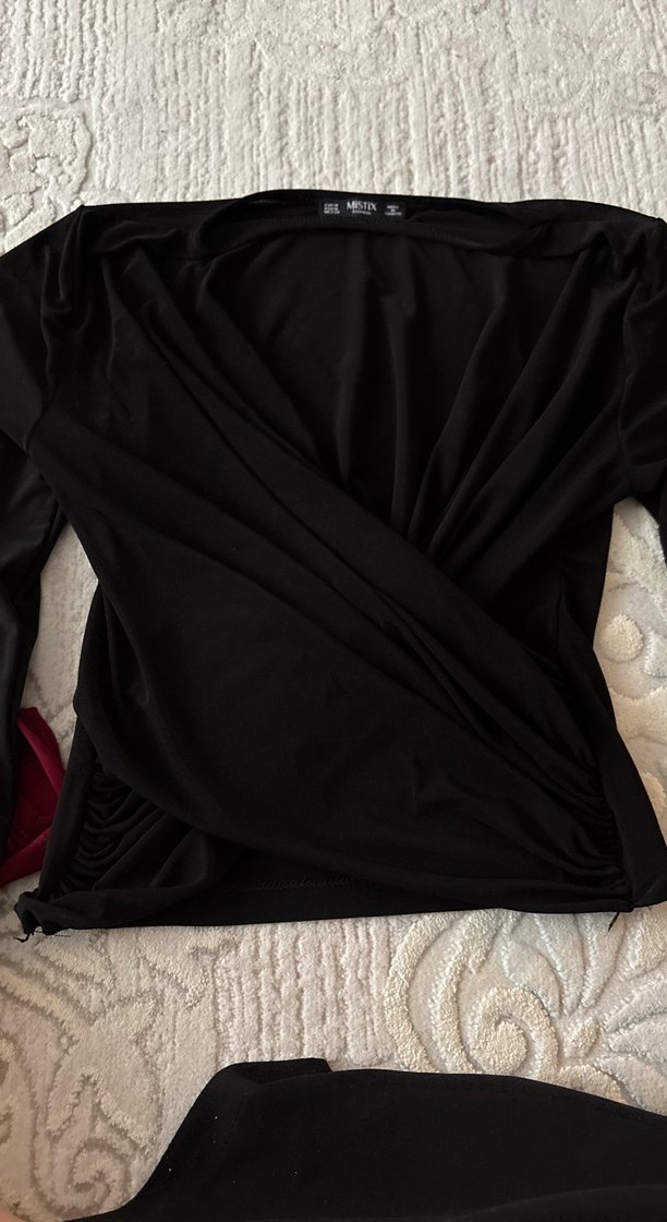 Siyah, satenimsi kumaştan, drapeli ve V yaka uzun kollu, gövdeyi saran midi uzunluğunda bluz. Cesur gotik tarzı için uygun. Etek üstü bluz