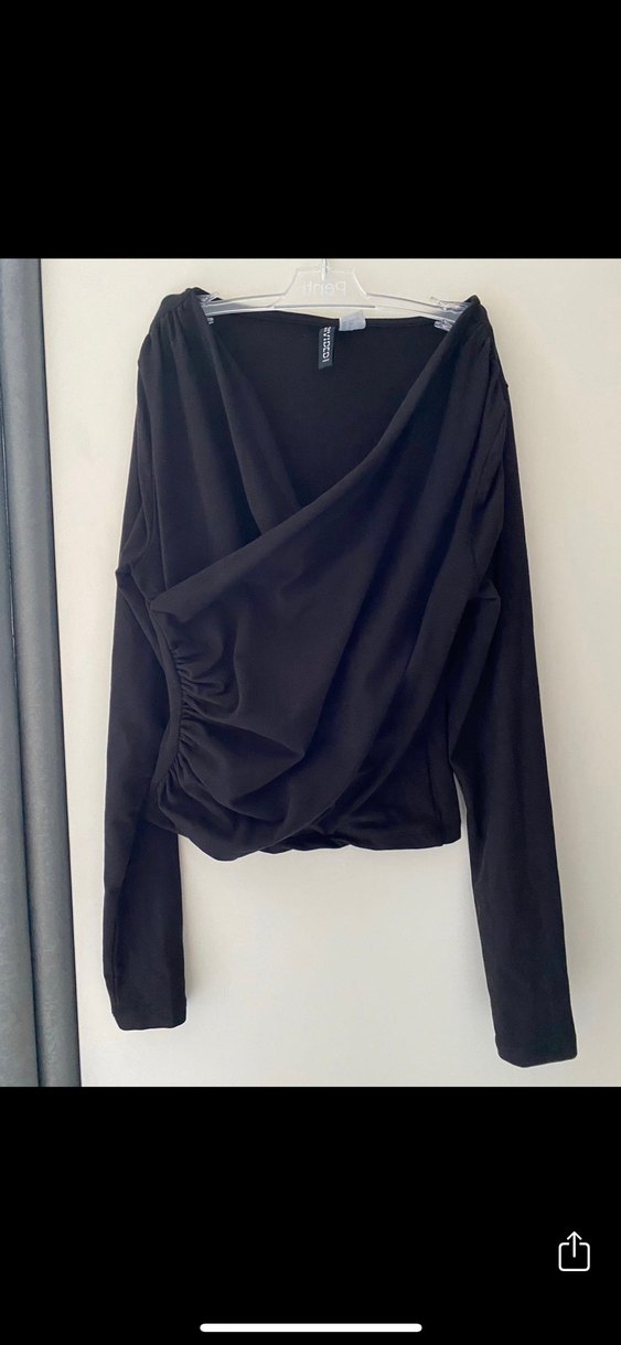 Siyah renkte, uzun kollu, drapeli V yaka ve vücuda oturan kesime sahip, sentetik kumaştan yapılmış minimalist goth tarzında bluz. Günlük kullanıma uygun.