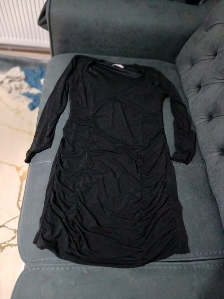 V yaka, uzun kollu, drapeli detaylara sahip siyah midi elbise, minimalist gotik tarzıyla günlük kullanıma uygun.