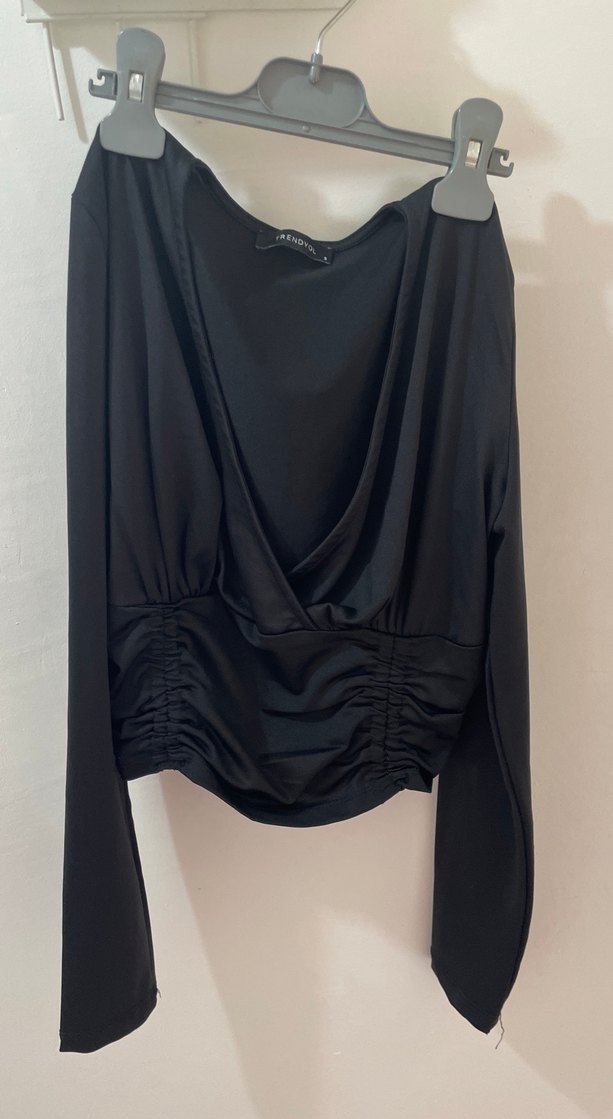 Siyah, drapeli tasarıma sahip, V yakalı ve uzun kollu, mini uzunlukta, satenimsi dokulu, gotik stil bluz. Cesur tarz için uygundur.