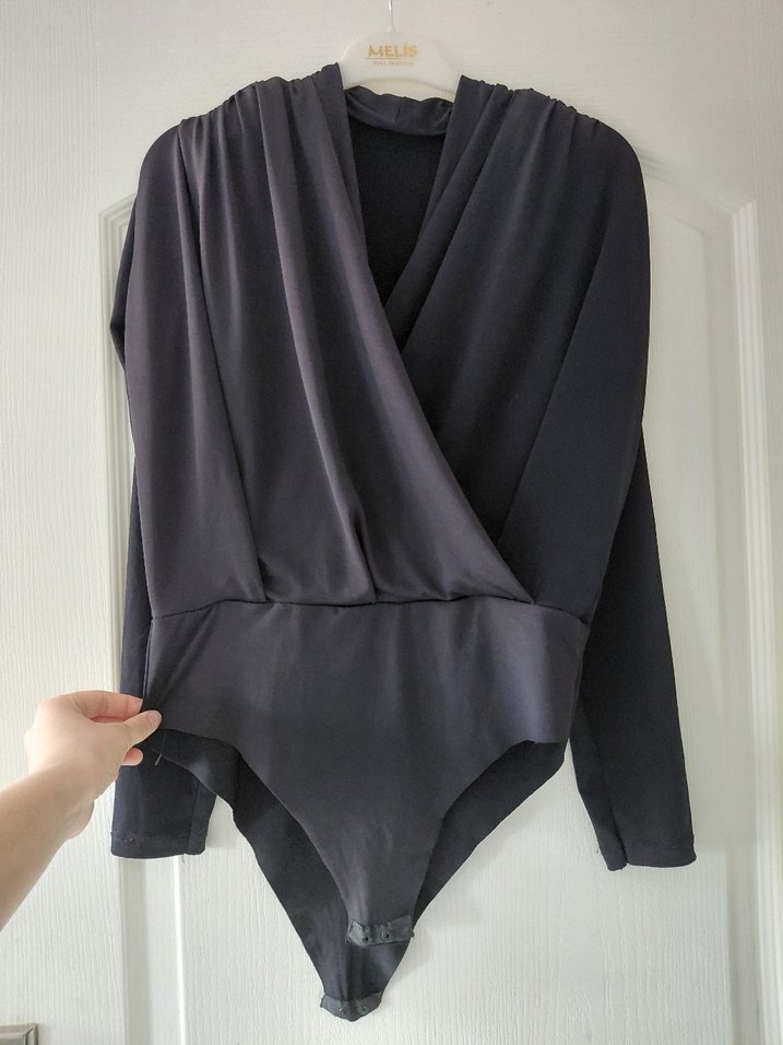 Siyah, drapeli V yaka ve uzun kollu, ince kesimli, ipeksi kumaştan midi uzunlukta minimalist gotik tarzda kadın bluz. Üzerinde "MELI" markası yer alıyor.
