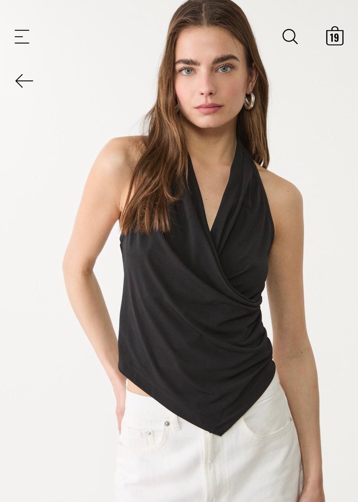 Siyah kolsuz bluz, V yakalı ve drapeli tasarıma sahiptir. Etiketli orijinal ürün
