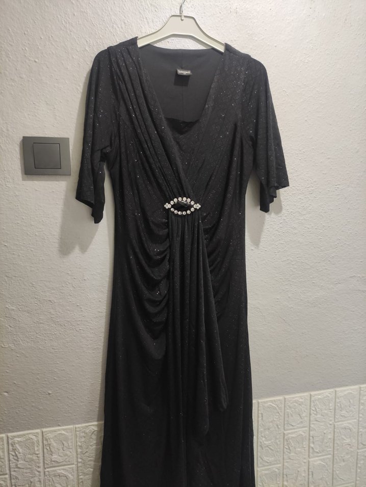 Siyah, kısa kollu, V yakalı, drapeli detaylı midi ve vücuda oturan abiye elbise. Gotik tarzda, düğünler için uygun.