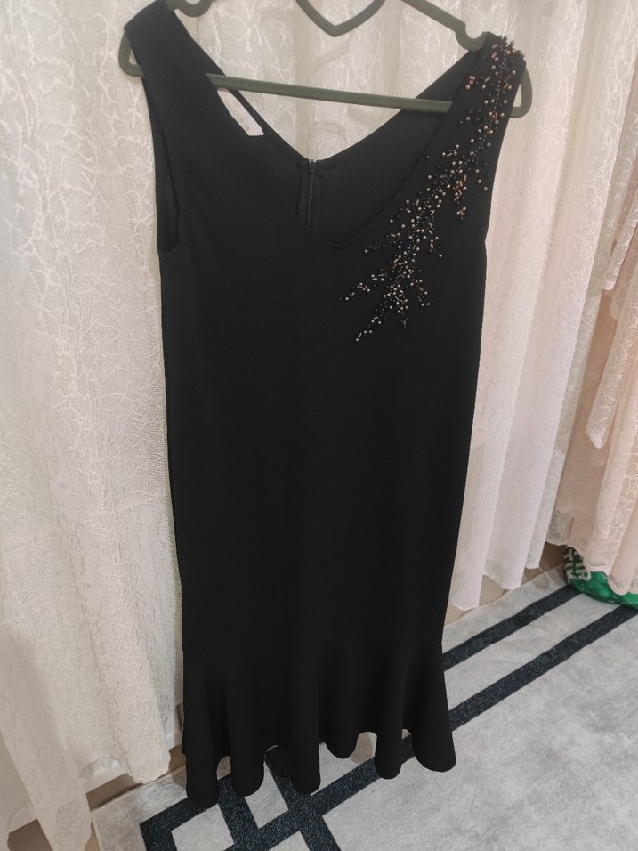 Siyah, kolsuz, v yakalı ve drapeli tasarıma sahip uzun abiye elbise. Tek omuzda süslemeleri bulunan gotik tarzda.midi boy abiye elbise.sayili giyilmiş
