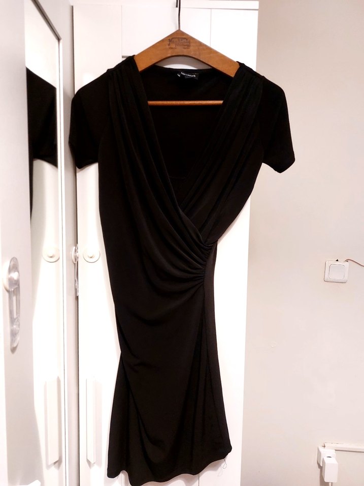Siyah, drapeli, V yakalı midi elbise, kısa kollu ve vücuda oturan kesimiyle öne çıkar. Network marka. fotolar çok güzel yansitamadi siyah olduğu için ama sorunsuz ve şık.